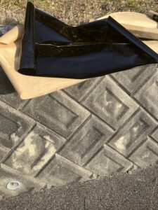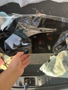 風が強すぎたので、トランクルームのところにフィルムを移動させましたが、もうこの画像でも分かる通り、シワクチャになっております。この時点でフィルム貼りはきれいにできない事は分かっていましたが、続けることにしました。