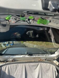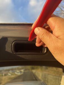 今回は、プリウスのバックドアの窓にフィルムだけを貼りましたが、バックドアのウインドウにフィルムを貼るには、まず内張り(上の写真では、黒い樹脂の部分)を外さないといけません ネットで検索してもらうとクリス50-1階の外し方はわかると思います。
