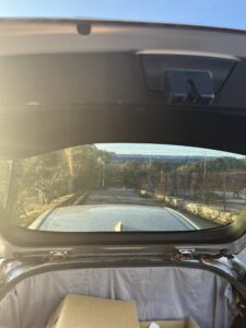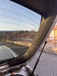 とりあえず下半分をつけました。下半分と言うのは、バックドアを閉めたときの状態です。フィルムは2枚重ねあわせますが、この順番で貼るのがいいとにネットで勉強しました。所々にシワが入ってますが、出来る限り伸ばして、中の空気も全て出しました。本当はここで乾くまで待って、上側のフィルムを貼ったほうがよかったかもしれません。実際に上側のフィルムを貼っていたら、先に貼っていた下側のフィルムがずれたり、色々と大変でした。