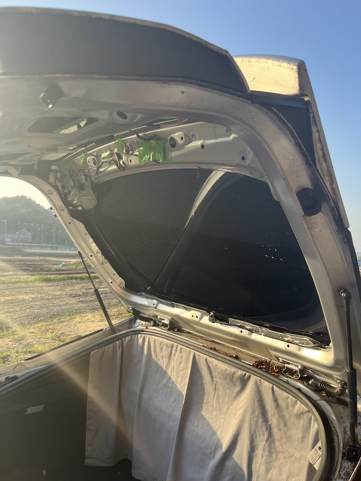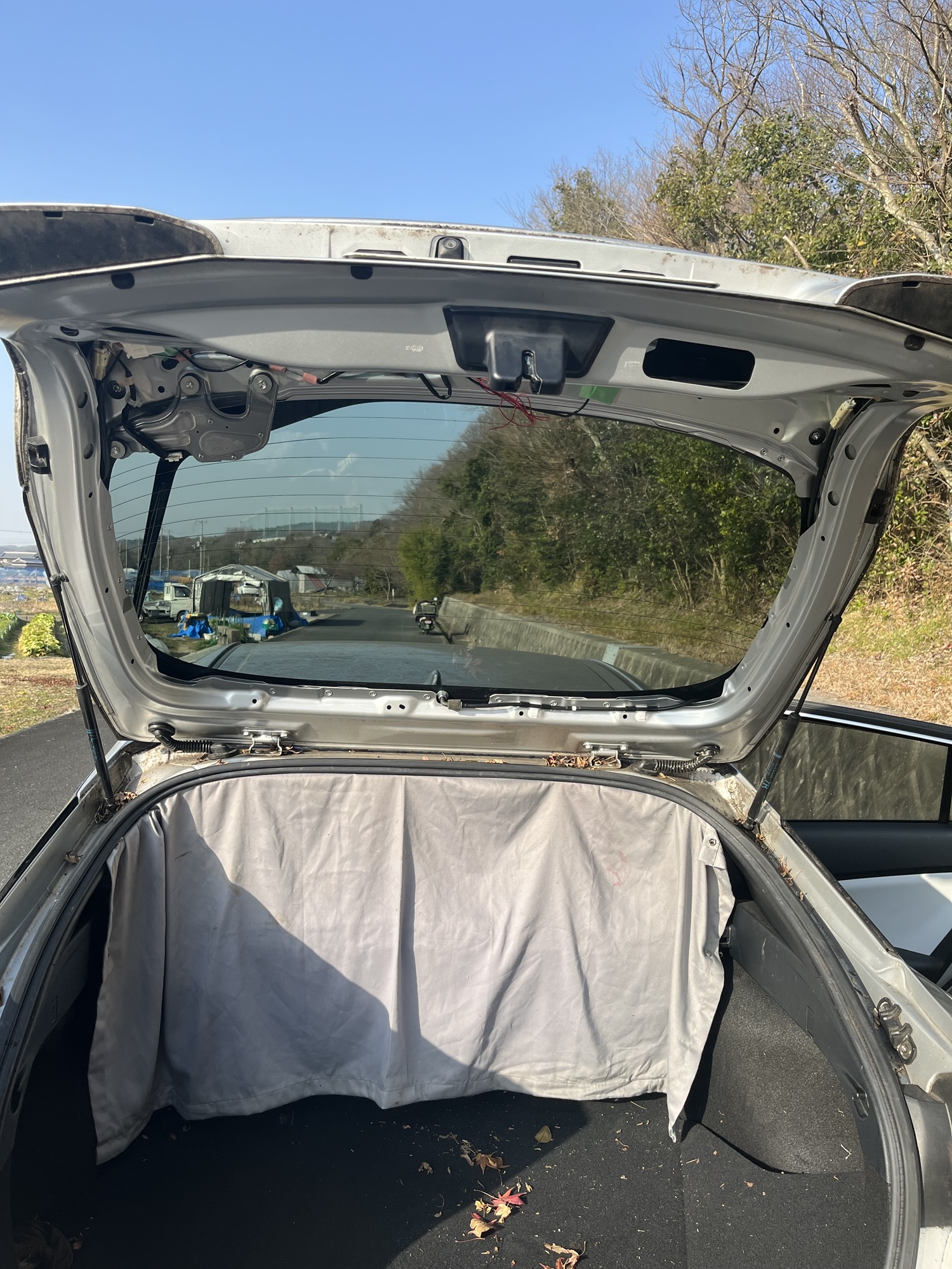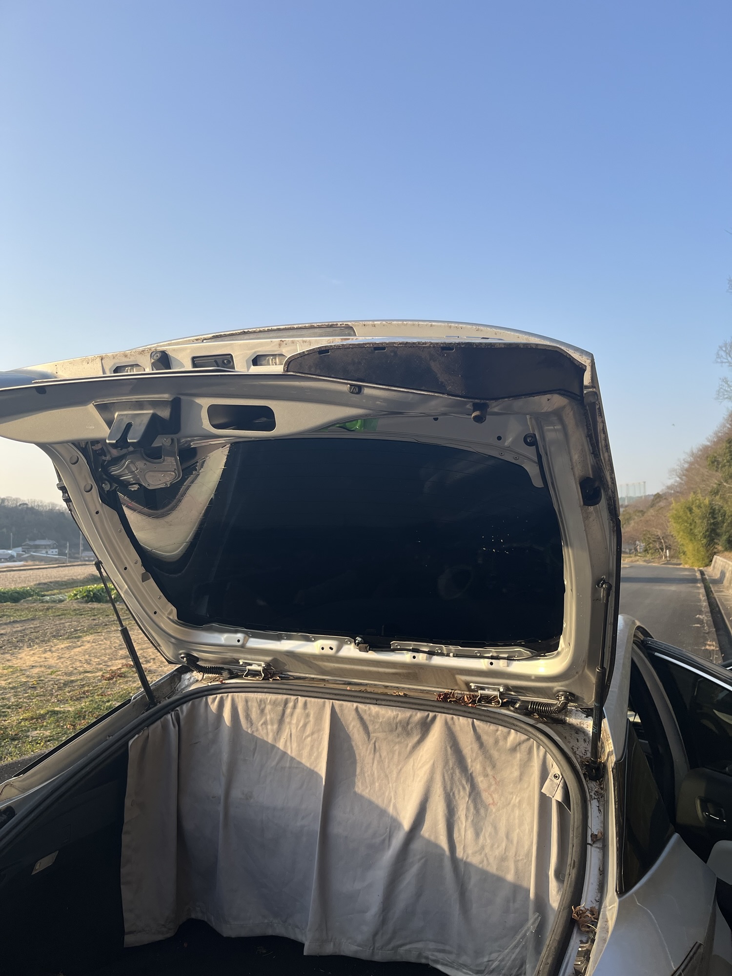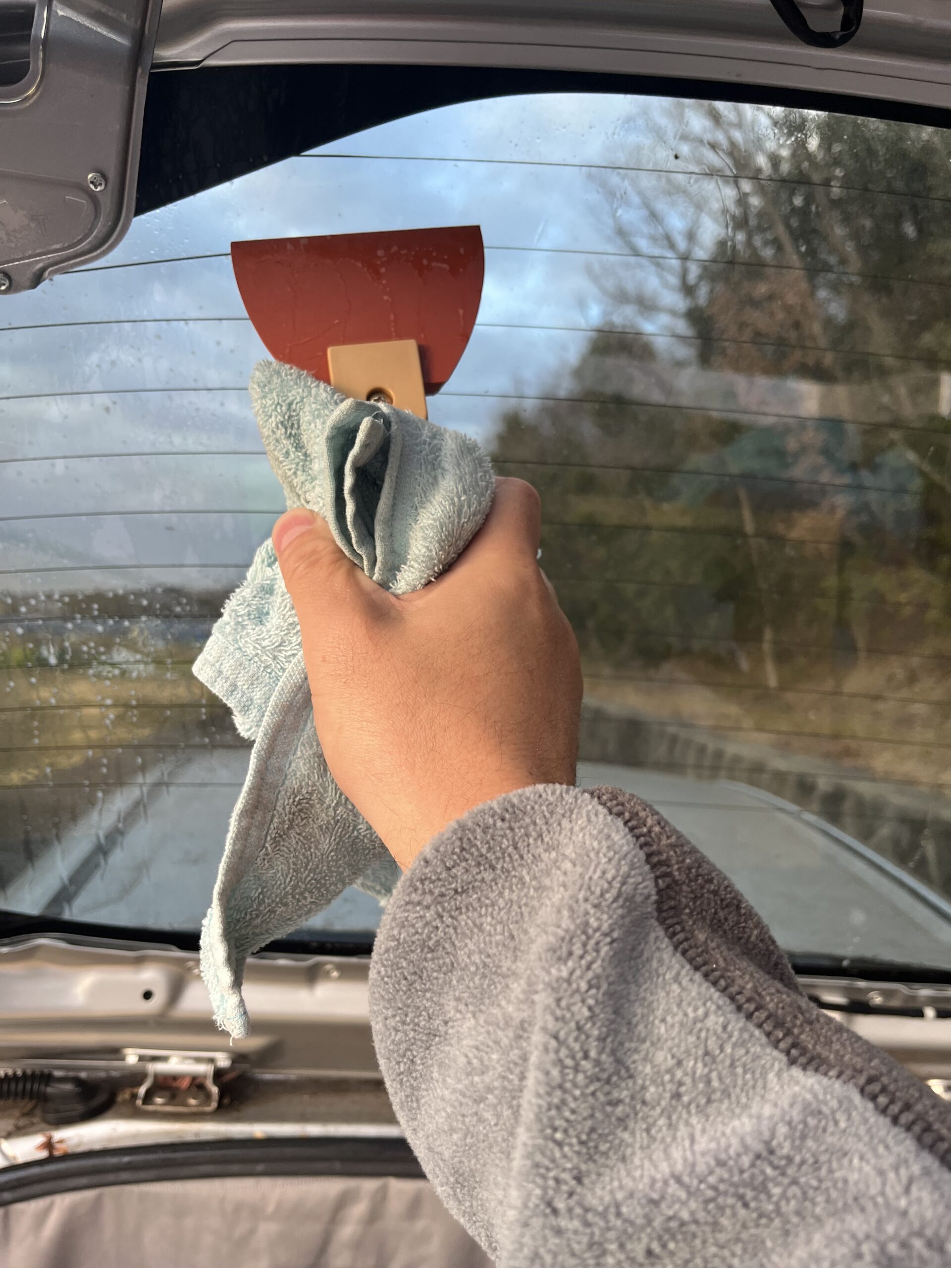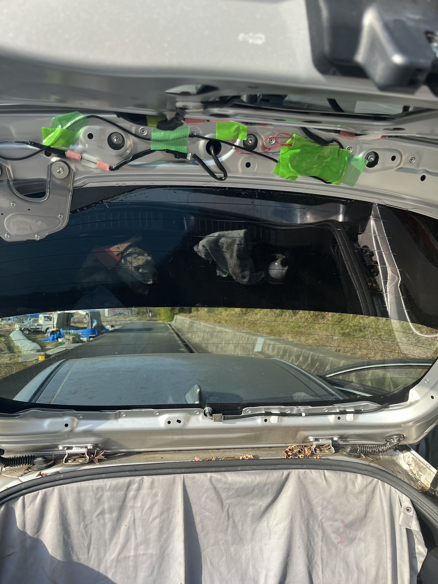 とりあえず下半分をつけました。下半分と言うのは、バックドアを閉めたときの状態です。フィルムは2枚重ねあわせますが、この順番で貼るのがいいとにネットで勉強しました。所々にシワが入ってますが、出来る限り伸ばして、中の空気も全て出しました。本当はここで乾くまで待って、上側のフィルムを貼ったほうがよかったかもしれません。実際に上側のフィルムを貼っていたら、先に貼っていた下側のフィルムがずれたり、色々と大変でした。