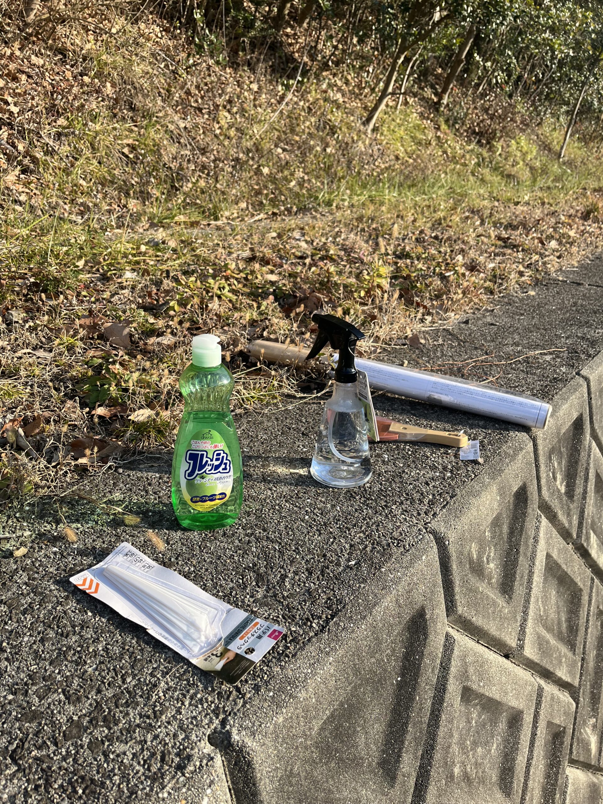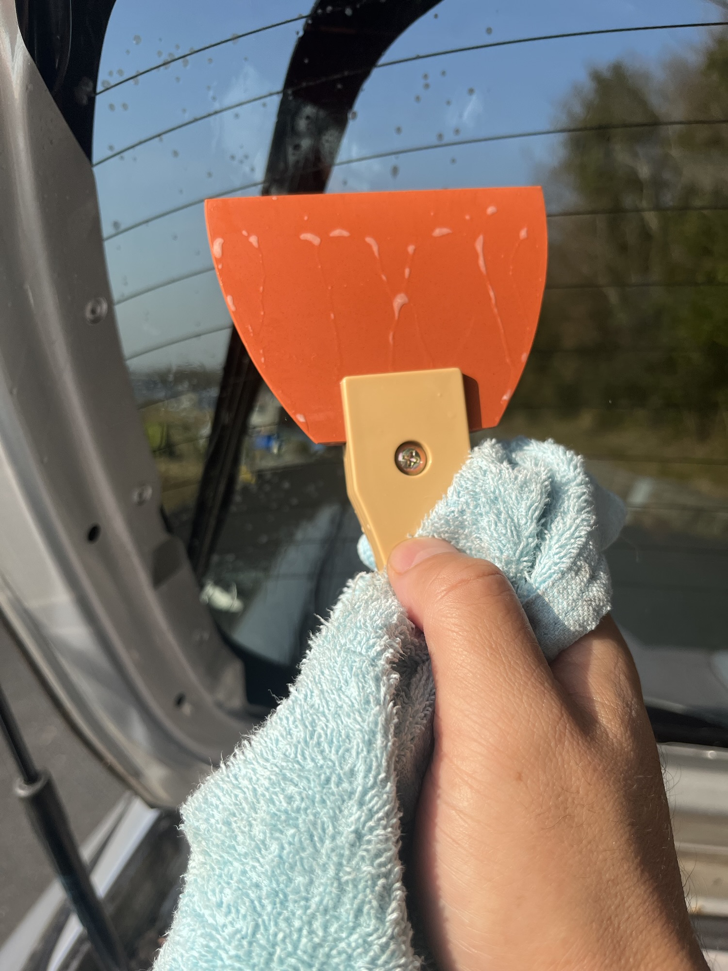 わかりにくい写真ですみません。ネットで言われてるように、洗剤とスプレーとヘラとスクレーパーを用意しました。電源がないので、ヘアドライヤーなどは使ってません。アマゾンで購入したプリウス50用のフィルムは、バックドアのウインドウは1面じゃなくて2つに分かれてるタイプを買いました。なので、ヘヤドライヤーは使っていませんが、後で思うとヘアドライヤーを使ったほうがよかったかもしれません。やはり端っこの湾曲した部分はシワがいきました。