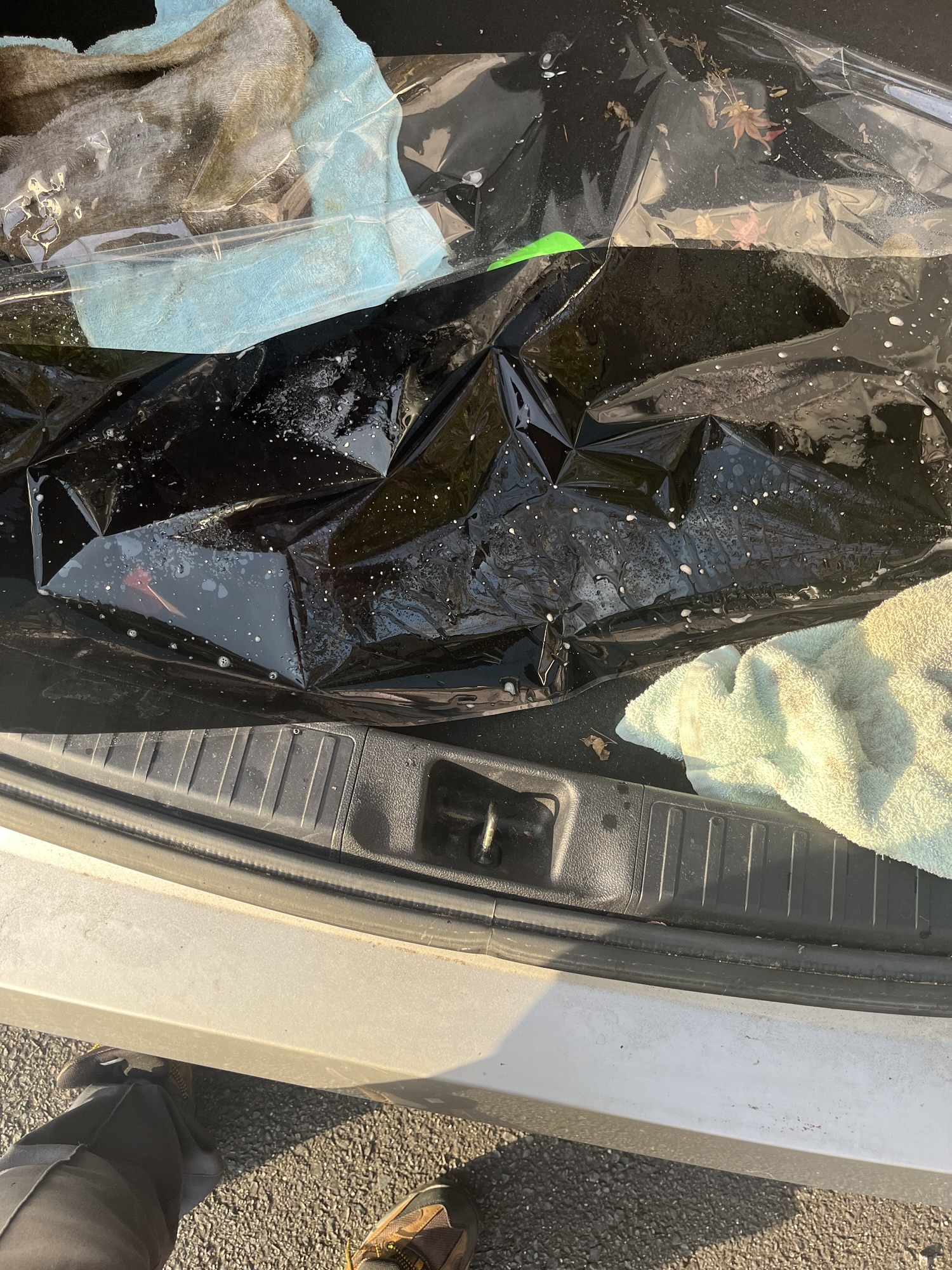 風が強すぎたので、トランクルームのところにフィルムを移動させましたが、もうこの画像でも分かる通り、シワクチャになっております。この時点でフィルム貼りはきれいにできない事は分かっていましたが、続けることにしました。